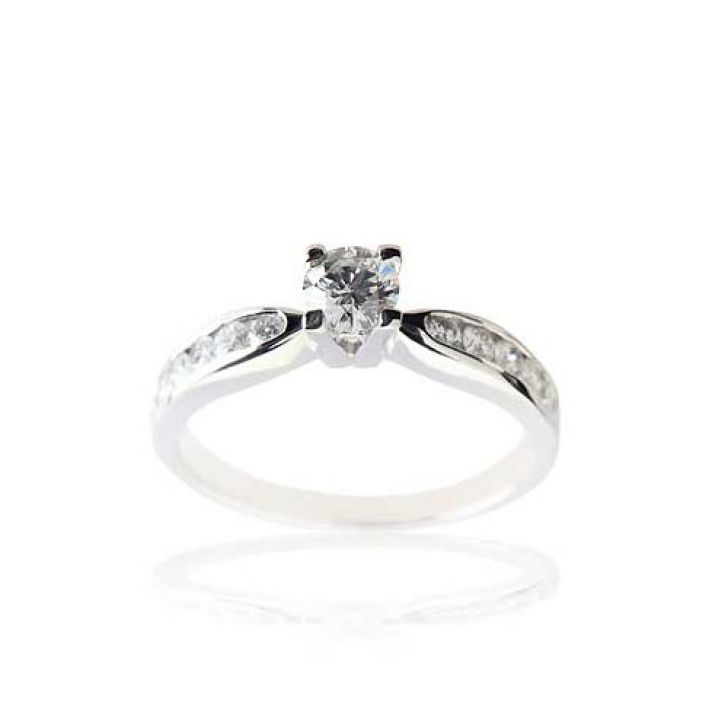 An engagement ring with 0.30 center diamond on 18K white gold.