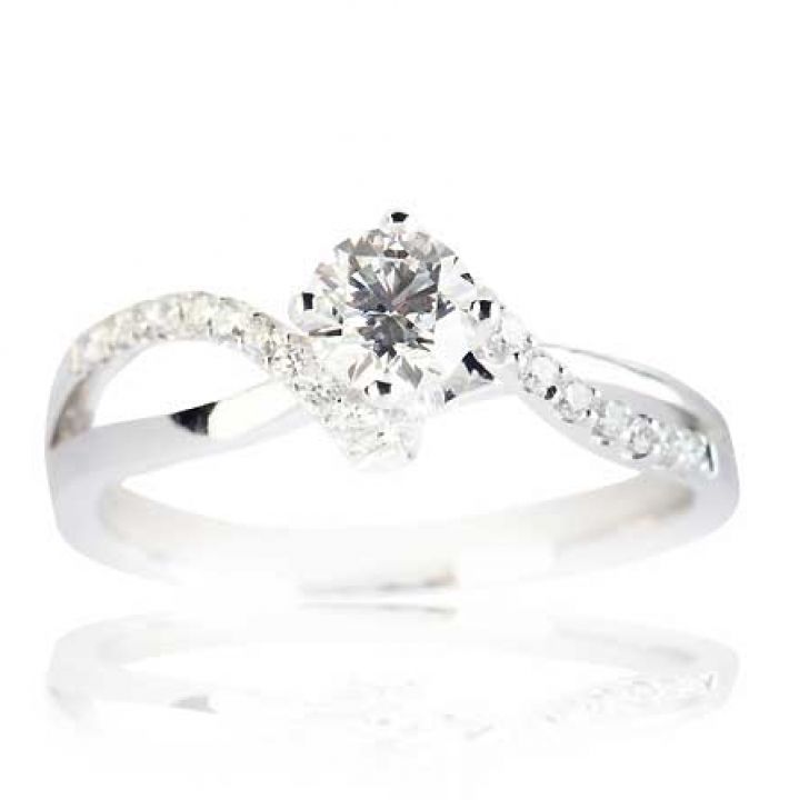 A twisted shank engagement ring with 0.40ct. round brilliant diamond center in 18K white gold.