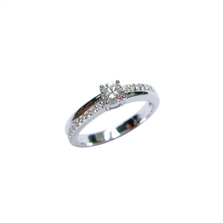 An engagement ring with 0.26 center diamond in 18K white gold.
