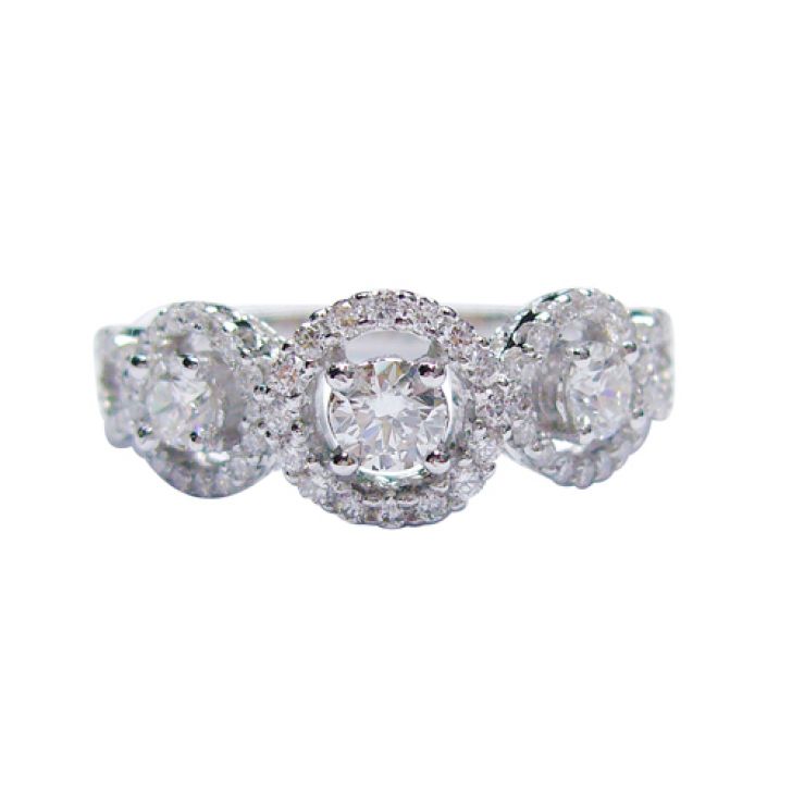 A triple round brilliant diamond engagement ring set in 18K white gold.